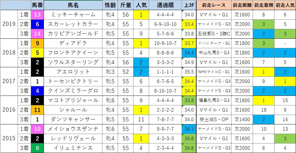 前走「ヴィクトリアマイル」組については、そこで先行していたか否かがポイント。「ヴィクトリアマイル」で3角4番手以内の競馬をしていた馬は【2-4-0-4】で、該当馬が存在した6年全てで連対しているという激熱データになりますので、該当馬は無条件でマークが必要です。