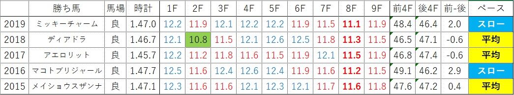 その後半のペースアップ位置はバラバラ。ただ2角を抜けて短い向正面の直線に入るのが残り5F目ですから、この地点からペースアップするのがオーソドックスな形。ただ牝馬限定戦ですから早めに動いてスタミナを削るような形にはなりづらく、概ね4Fロンスパ戦になると考えれば良いでしょう。従って極端に速いラップを求められることはありませんが、4F通過が48.0秒を超えた2010年・2016年・2019年はラスト2F目にそれぞれ11.2秒・11.2秒・11.1秒の速いラップを踏んでいますので、かなりのスローが想定されるようなメンバーの場合にはトップスピードのレベルにも気を配る必要があります。