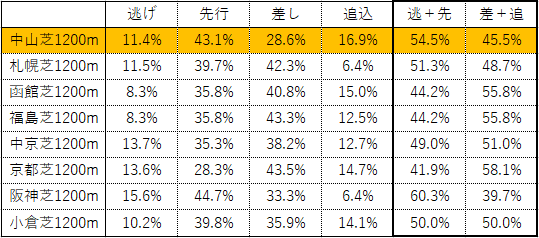芝1200m戦で言うと、基本的には基礎スピードが高い馬しか出走して来ない距離ですから、速いラップを刻んでも簡単には失速しませんし(上級条件戦では特に)、序盤に後続との物理的な差を作ることが出来ると言う意味で前半からペースを「上げやすいコース」は先行馬有利。中京コース以外は直線距離が360m以下と長くないことも先行馬をアシストします。