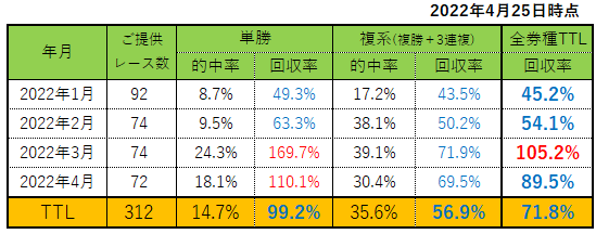 ※1,2月の重い負債を返済していくことが先決になりますので、4月以降は確実に回収出来る単複を中心に予想を提供させて頂きます(3連複の買い目は提供させて頂きます)