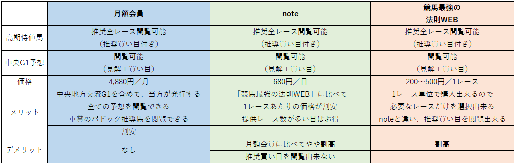 A.一覧表を作成しましたので、以下の一覧表をご参照下さい。尚、当たり前ですが出している予想は全く同じもので、媒体によって予想を変えているなどと言うことはございません。「月額会員」にご加入頂くのが圧倒的にお得です