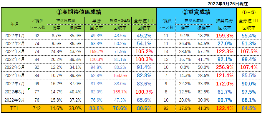 まずは9月までの「高期待値馬(及びその関連馬券)の成績」と「重賞予想成績」を掲載します。