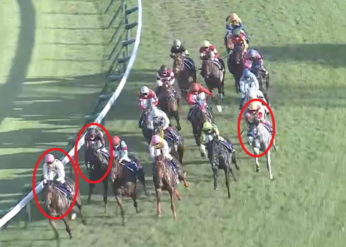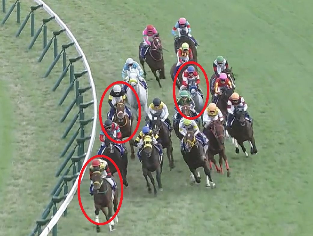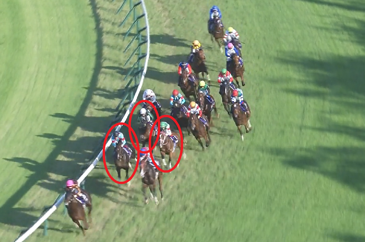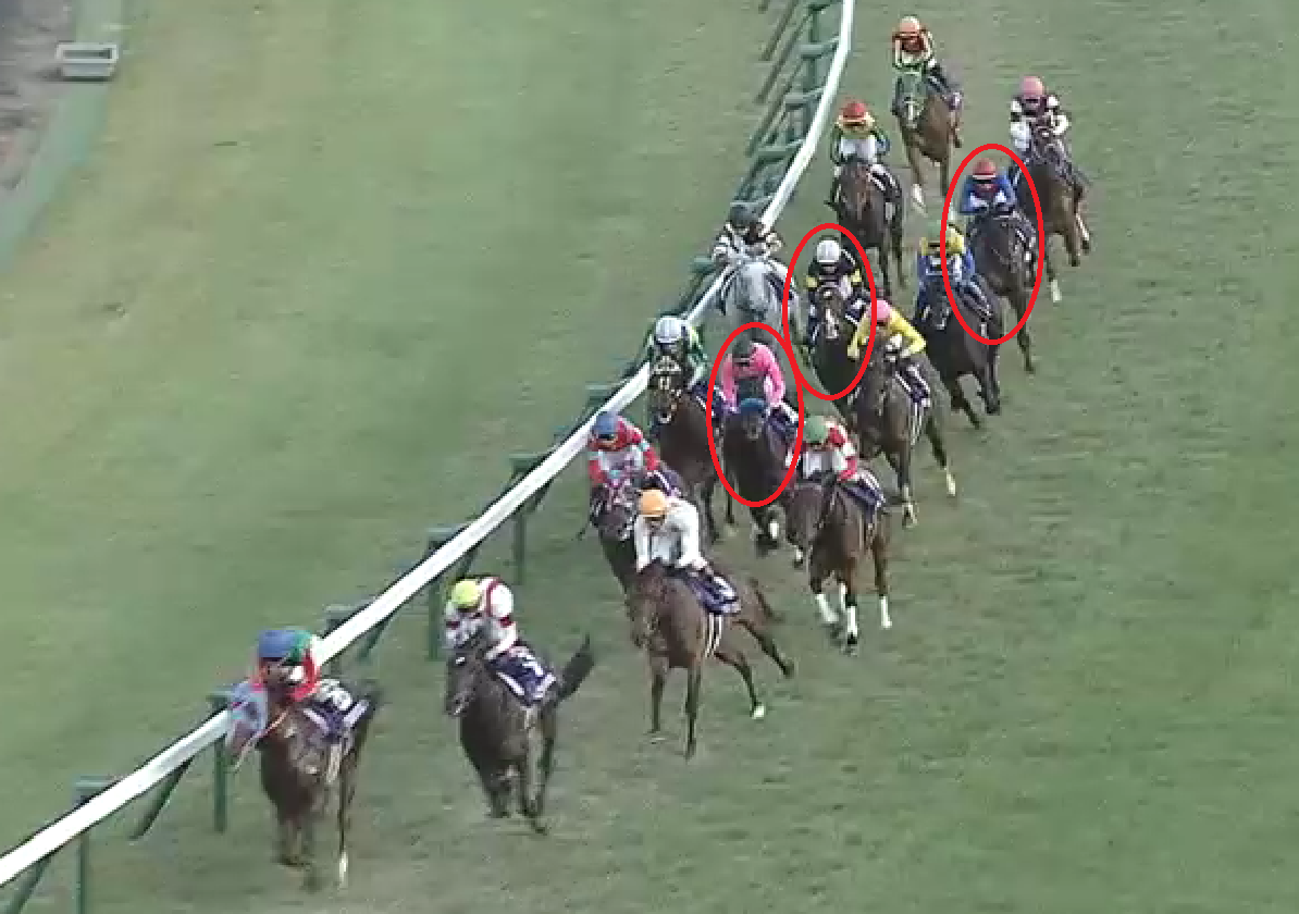 これらは直近で前後半差が小さくなった4年の4角画像ですが、スプリント戦の瞬発お化けだったレッドファルクス以外は、概ね「内・前」を立ち回っていることが分かります。2015年こそ微妙ですが、それでも通している位置は内ラチ沿いから2頭目。昨年1人気を裏切ったダノンスマッシュのように、ここで外を通すことは致命傷になりかねません。