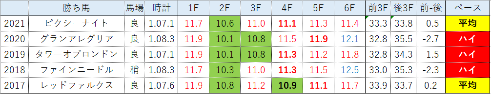 従って今年のスプリンターズSも基本的には極端に速いペースにはならず、前後半差の小さいレースになると決め打って良いかも知れません(但し時計が掛かる馬場ではないと言うのが大前提ですし、メンバーや枠の並びでは真逆の考えになることは当然あり得ます)。