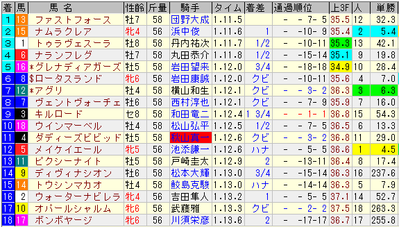 ただ基本的にデキの良さだけで能力差は埋められないと言うのが私の基本的な考え方で、前走ではナムラクレアに着差以上の完敗。いくらデキが良いと言っても逆転は無理と思えましたし、相手強化となると足りないと結論付けましたが、結果的にはこちらの想像以上の上昇幅を見せたと言うことでしょうし、もちろん馬場の助けもあったでしょう。それにしても素晴らしい変身ぶりで、レース後には予想を外した悔しさよりも、サラブレッドの奥深さに感動したほど。本当に素晴らしい快走でした。