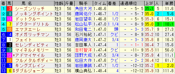 1着シーズンリッチは出して行ったものの、他が速かったので即座に控える判断をした角田大河Jのファインプレー。出して行ったので序盤は掛かりましたが、3角では落ち着きました。これまではスローラスト3F戦でトップスピードの持続力不足を露呈し続けた結果。淀みない流れのレースで完勝を収めたことで、こういう持続力や持久力が問われるレースが合うとハッキリしましたね(念のためですが、トップスピードの持続力と平均的に速い脚の持続力は能力の種類が違います)。今後も展開次第で上げ下げすれば良いでしょう。今日は騎手が勝たせた面が大きく、好騎乗でした。角田大河J、重賞初制覇おめでとうございます。