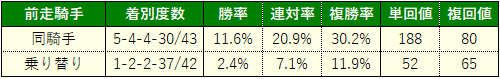 前走から継続騎乗だった場合に良績多数。単純に「乗り慣れている」ことが大きいのでしょうが、有力馬が集中しやすいがゆえに騎手にとってはお手馬が被るパターンは珍しくなく、「選んだ馬」が良績を挙げていることも理由の一つでしょう。事実、過去6年でお手馬が被ったと思われるパターンは6例ありましたが、「選ばれた馬」の成績は【2-0-3-1】でした。