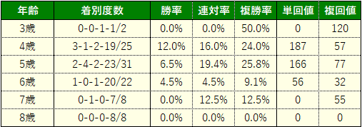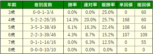 そしてスピード決着であるが故に、加齢と共にスピード能力が衰える高齢馬は劣勢の傾向。