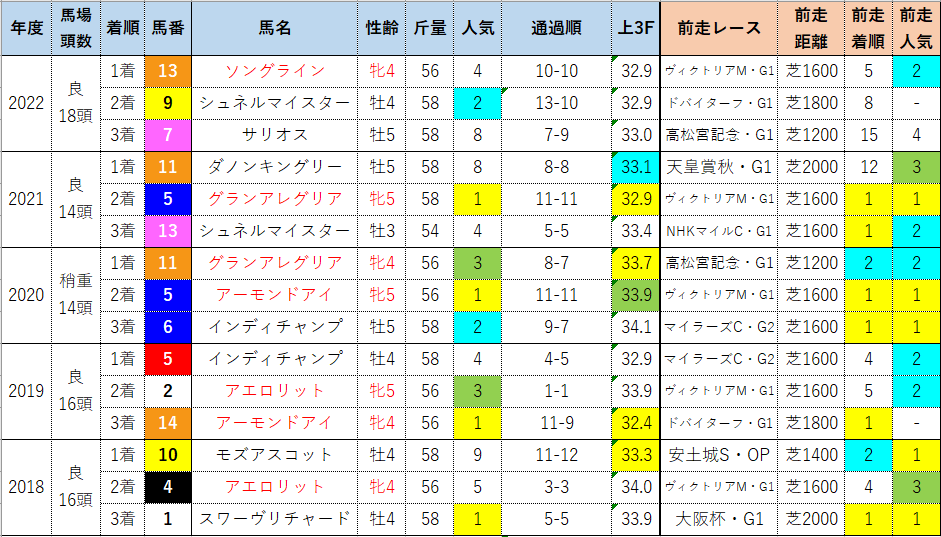 そして全マイルG1の中でも最もタイトなラップ=ハイレベル戦になりますのでフロックは起こりにくく、過去10年の3着内好走馬30頭中22頭はG1連対実績を持っていたことで共通。非該当の8頭中3頭にはG1で3着好走実績を持っていました。G1馬が10頭も出走する今年も、G1実績の無い馬が好走することはそう簡単ではないと思います。