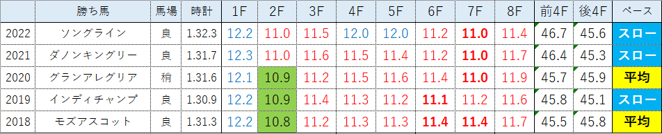 次に過去5年のレースラップと3着内好走馬一覧を見ておきます。