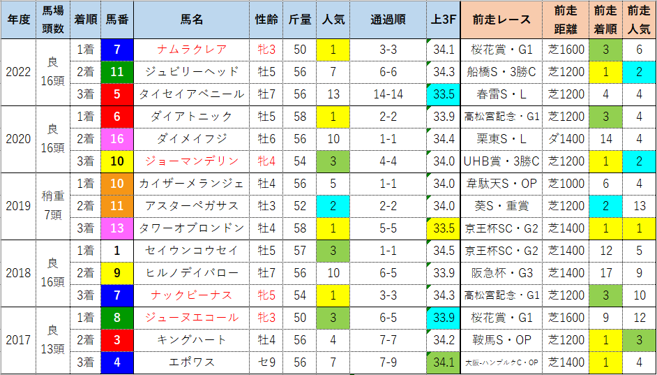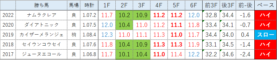 これらを踏まえた上で、過去5年のレースラップと3着内好走馬一覧を見てみますが、2021年はオリンピック開催による変則開催で札幌開催となりましたので、2021年のデータは抜いています。
