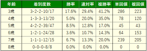 ご覧のように斤量の恩恵がある3歳馬は圧倒的有利で、特に昨年まで50㎏で出走出来ていた3歳牝馬は【3-0-1-3】勝率42.9%(単回値695円)・複勝率57.1%(複回値290円)ですから、出ていればとりあえず買っておくべきレベルです。