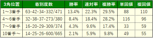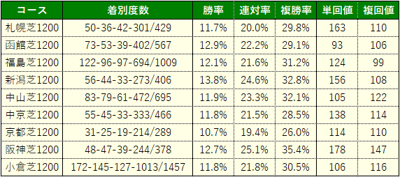 これは各芝1200mコースにおける3角4番手以内通過馬の成績(13頭立て以上・過去5年・新馬戦除く)ですが、最も好走率が高いのは阪神芝1200mで、次点が中山芝1200m。この両コースは下りスタートで、中山は外回りコースなのでコーナーで減速しづらく、阪神は3~4角のコーナー半径が大きいので同じく減速しづらい造りと言うことで共通。つまりは基礎スピードが活きやすいわけですが、スプリンターの先行馬なんて概ね基礎スピードに優れているわけですから、この両コースの成績が良いことにも納得。
