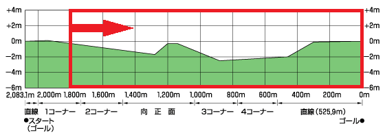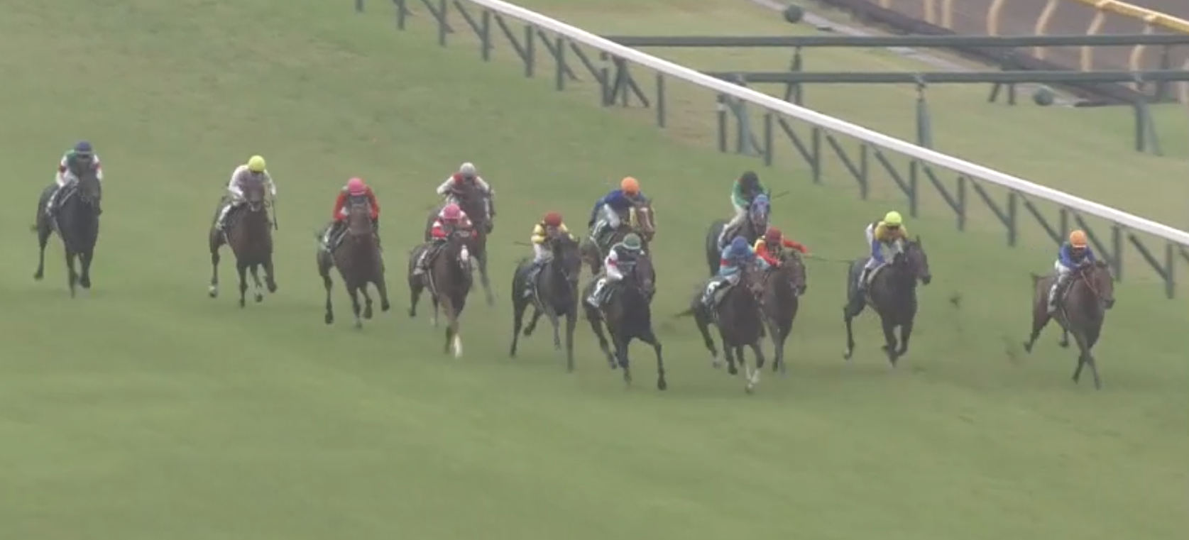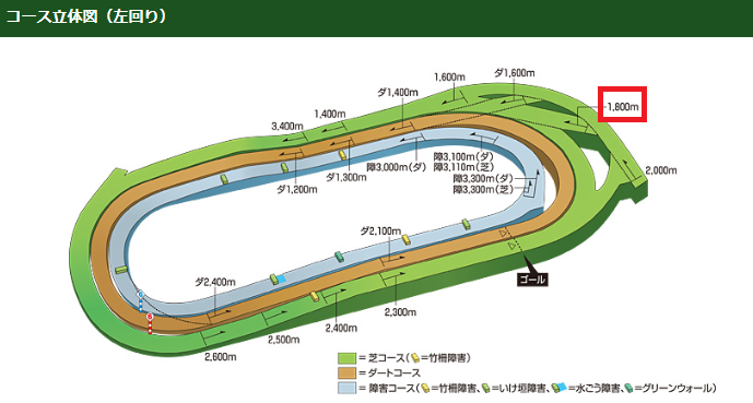 スタートは1~2角中間のポケット。2角に向けて直進して本線に合流する形になりますが、Cコースの場合は2角までの直線距離がわずか144mしかないため、スタートダッシュに優れた馬でないと位置は取れませんので、二の脚で先行するタイプにはかなり難しいコース。本線に合流してからは向正面にコブがある程度で特に大きな特徴はなく、半径が大きく緩いコーナー、日本で2番目に長い直線であることから道中の動きは少なく、概ね4角あたりからペースアップして直線での攻防になりやすいコースです。基本的には世間一般が描く東京コースらしく瞬発力の有無が勝負を分けやすいと考えれば良いでしょう。