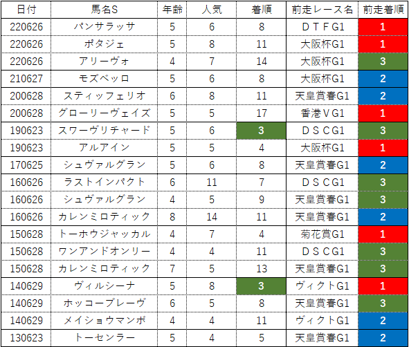 中でも前走天皇賞春で3着内好走していた馬(=赤字馬名)は【1-0-1-6】と人気と実績を考えると大不振。これは春3戦目&3200mと言う距離で激闘をした後の中7週と言う決して楽ではないローテーションが響いているとしか思えず、単勝1.4倍を裏切って必要以上の大敗を喫した2017年キタサンブラックはその典型例だったでしょう。