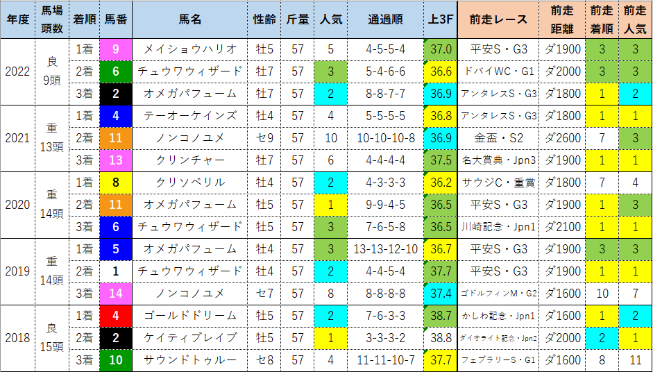 そんなスローペース年も含めた過去5年で3角2番手以内馬の好走例は無し。テイエムジンソク(3人気)・インティ(1人気)・カジノフォンテン(3人気)・クリンチャー(4人気)と言った上位人気馬がことごとく消えているように、やはり逃げ・先行馬にとっては非常に難しいコースであることは間違いありません。
