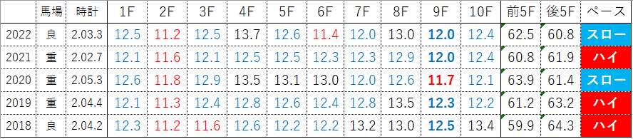 それを踏まえて過去5年のレースラップと、3着内好走馬一覧を見てみます。