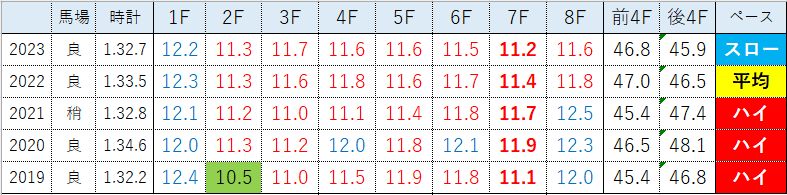 ここで過去5年のレースラップと3着内好走馬一覧を見ておきます。