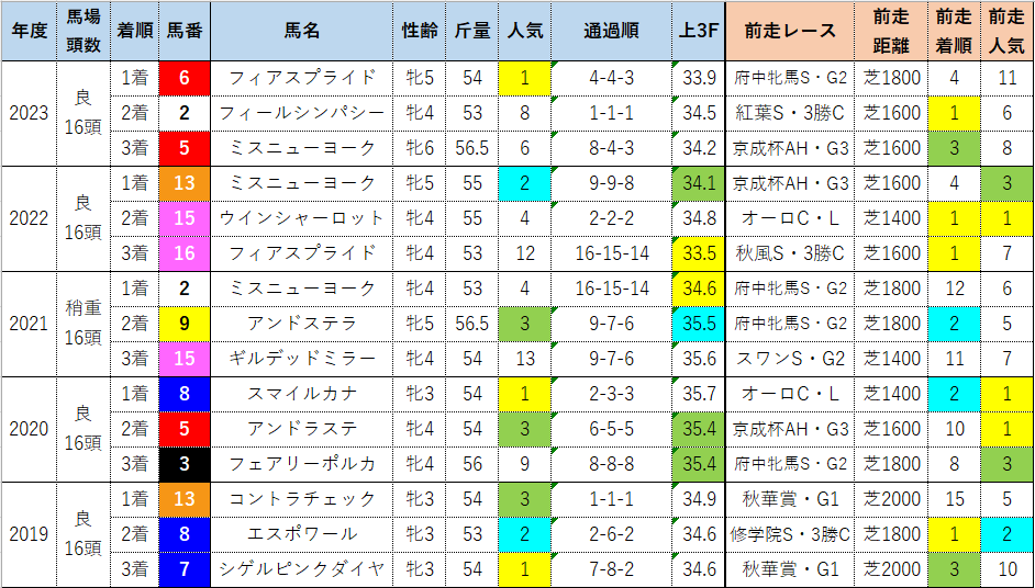 そしてこのリピーター6頭中5頭は5,6歳馬でしたが、この5頭を除く5,6歳馬の成績は【0-0-0-38】でリピーター以外で馬券に絡んだのは3,4歳馬のみ。実績馬は早期引退しやすい牝馬だけに、基本的には3,4歳馬の戦いと考えて差し支えないでしょう。