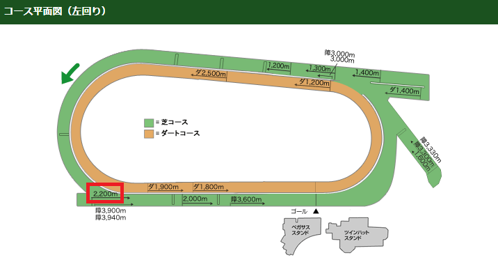 また、2000mコースが緩→緩→急になりやすいのに対し、2200mは急→緩→急の流れになりやすいですから、比較的差し馬優勢になりやすいコースであることも覚えておきたいです。