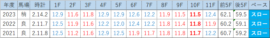 これらを踏まえて過去データを見てみたいですが、3着内好走馬データは京都・中京開催混在の過去5年分を、レースラップについては中京開催のみ過去3年分を掲載します。