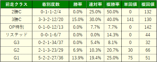 日経新春杯は基本は京都芝外2400mが舞台ですから、場所も距離も異なる中京開催でも共通して参考になりそうなデータは多く存在しません。ただその中でも前走クラス別成績は参考になりそうで・・・