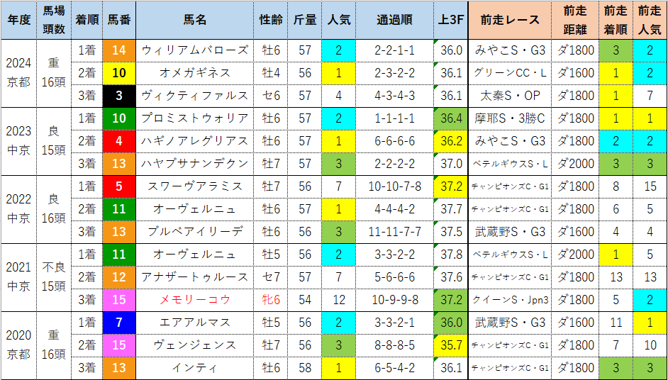 ただし、8人気以下で馬券に絡んだ5頭が全て中京開催での好走馬だったように、両極端な展開になる傾向がある中京では穴馬にもチャンスがありますから、展開に乗じることが出来る穴馬には注意したいです。