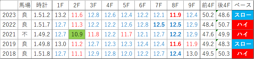 中京開催過去10年では、ハイペース4年・平均ペース2年・スローペース4年。ハイペース4年中3年は前後半差2.0秒以上のかなりの前傾戦であるのに対し、スローペース4年中3年は前後半差1.5秒以上のそこそこのスローペースと両極端なペースになっており、これはつまりメンバー次第だと言うこと。そういう点で読みにくいレースではありますね。