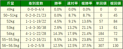 これは斤量別成績ですが、斤量が重くなる毎に好走率も期待値も上がる傾向が。「つまりレベルが低い=格下にもチャンスがある」と言う考えではなく、「レベルが低い=能力上位馬が走りやすい」と考えるのが正解なわけで、どういう臨戦過程であっても相応のハンデを背負っている馬を優先すべきレースです。