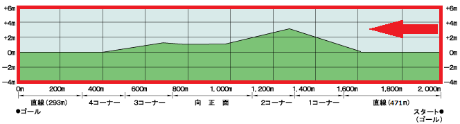 スタートは4角ポケット。最初のコーナーである1角まで約470mと十分な長さの直線がありますし、1~2角も45度コーナーで長さも標準的ですから極端にペースは落ちず、前半からペースは流れやすい傾向。2角を回って向正面に入ると早々に残り1000mに達しますから極端に緩む間もなく3角へ。つまり全体的に淀みなく流れる構造になっており、前半に約3m上るレイアウトで完全平坦でないことからもタフさが求められるコースです。