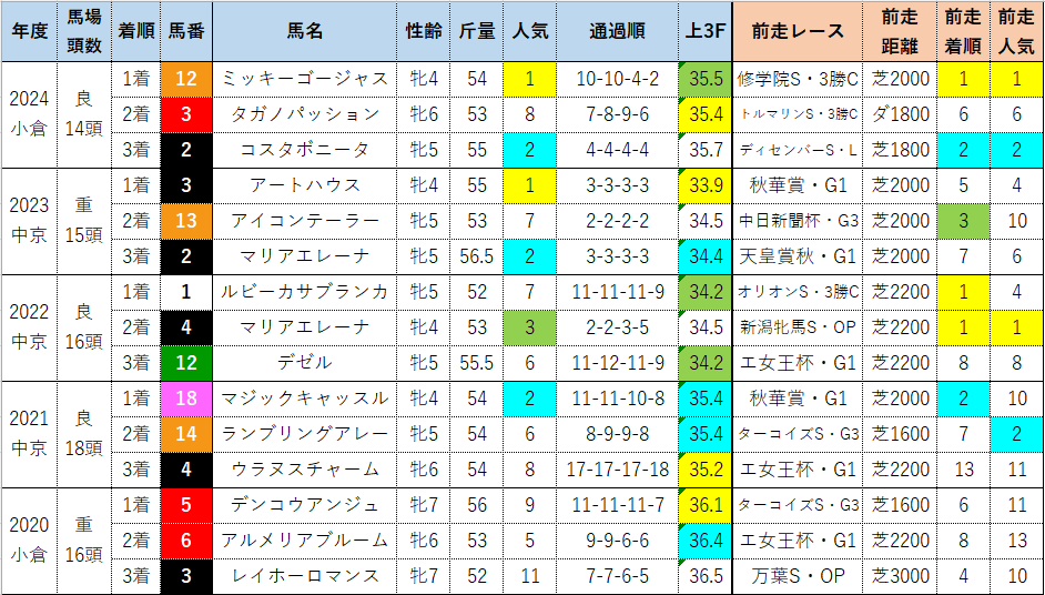 続いて過去データを見てみますが、牝馬限定のハンデG3・芝2000mの条件は旧愛知杯と同じですので、旧愛知杯における過去5年の3着内好走馬一覧を掲載します。