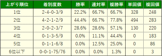 そして、前走上がり順位3位以内馬が【3-4-3-19】勝率10.3%(単回値100円)・複勝率34.5%(複回値118円)と堅調でもあります。