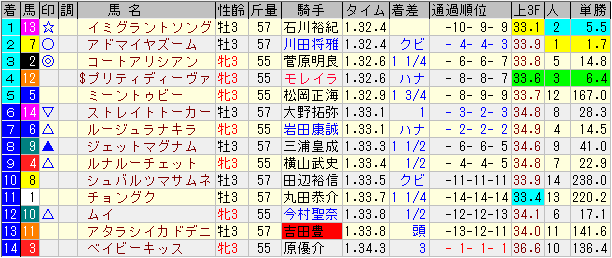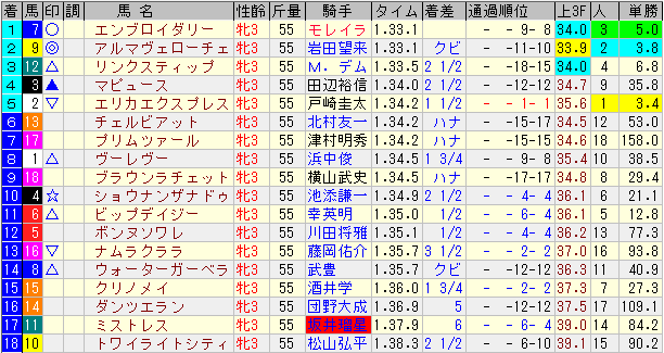 6着消チェルビアットは展開が向きましたし、こういうペースパターンも合う馬だとは分かっていましたが、距離は長いだろうと考えていましたので6着にまで走れたのは少々意外。このあたりは流石はショウナンパンドラの下で、底力があります。今後もマイルまでは楽しめそうですが、ペースが落ち着くパターンでも走れるかはやや疑問で。