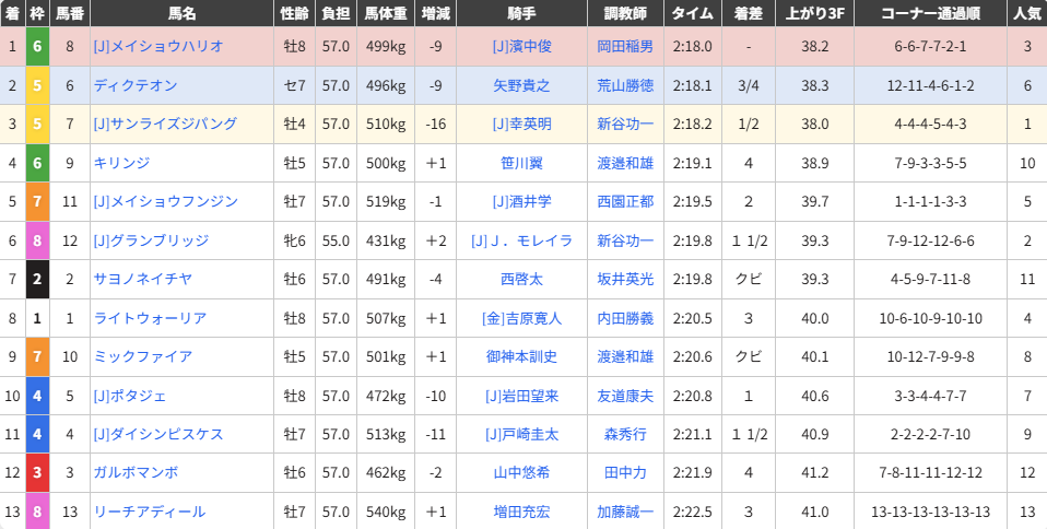 このレースについてはライトウォーリアが出遅れた時点で終わり。そうなるとメイショウフンジンの楽逃げで前半から超スローに。タフな流れでパフォーマンスを落とすメイショウハリオには絶好の展開でしたし、逆にタフな流れになって欲しいグランブリッジには最悪の流れ。中盤は緩むものの前半は逃げ争いでそれなりにペースが上がる想定だっただけに、こうなっては当たらないのも当然です。ライトウォーリアが出遅れることを80%以上の確率で当てることなど不可能ですから、これは事故のような外れレースでしたし、想定ペースだったならば「ディクテオン―サンライズジパング-キリンジ」の激熱3連複が当たっていた可能性は大いにあり得て、そういう意味では悪くない予想は出来たと認識しています。ディクテオン=矢野Jはかなり上手に乗ってくれました。