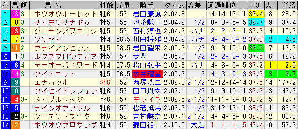 8着ピューロマジックは有り余るスピード能力が最大のストロングポイントだけに、緩い流れからの瞬発力勝負では見劣ってしまいます。レース振りは想定したものだけに文句は無かったですが、流石に流れが遅すぎました。その分道中で掛かってしまいましたし・・・また、急坂がダメかも知れませんね。それは3歳早期にも見せていた面で決して頭に無かったわけではないですが、力を付けた今ならば克服出来るだろうと考えてしまった私のミス、と言うか考えが浅はかでした。申し訳ございませんでした。