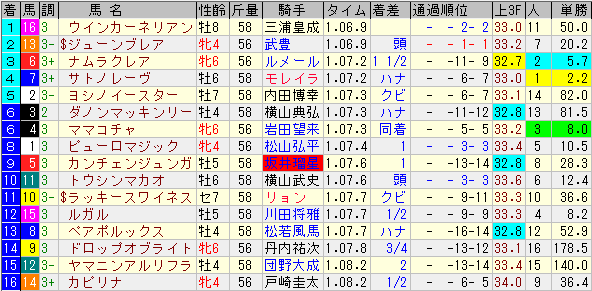 1着▽ウインカーネリアンに関しては、とにかく三浦Jおめでとう!それしかないです。大外枠の逃げ馬で行くしかない状況、ジューンブレアの方が速かったので番手で手を打つ、スローなのでなるべく早めに逃げ馬に馬体を併せる、これって基本中の基本で特に激賞するような騎乗内容ではないです(別に三浦Jを下げたいわけではないです。あくまで冷静な感想)。あえて褒めるとすれば、「これ、G1勝てるかも」とリアルの感じられたはずの勝負所でも焦らずにセオリー通りに乗れた冷静さで、126回も苦汁をなめた経験がここで生きたのでしょう。馬に関しては、25アルクォーツスプリント同様に展開に恵まれた上での好走で、再現性は低いと言わざるを得ません。