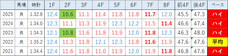 これらを踏まえた上で、過去5年のレースラップと3着内好走馬一覧を見てみます。