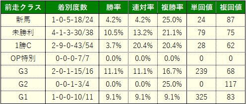 →前走5着以下馬【0-1-0-23】とほぼノーチャンス。前走4着以内馬でも前走が関西圏のレースでは【0-1-0-8】。前走関東圏のレースでは【2-7-0-12】勝率9.5%(単回値72円)・複勝率42.9%(複回値120円)なので狙えるのはこれに該当した馬だけ。